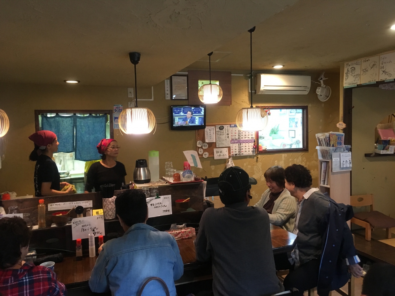 店内はあまり広くなくて、カウンター席、テーブル席と座敷がありましたが、満席だったので、店内で待っていました。しばらくして席が空き、4人掛けのテーブル席に案内されました。
