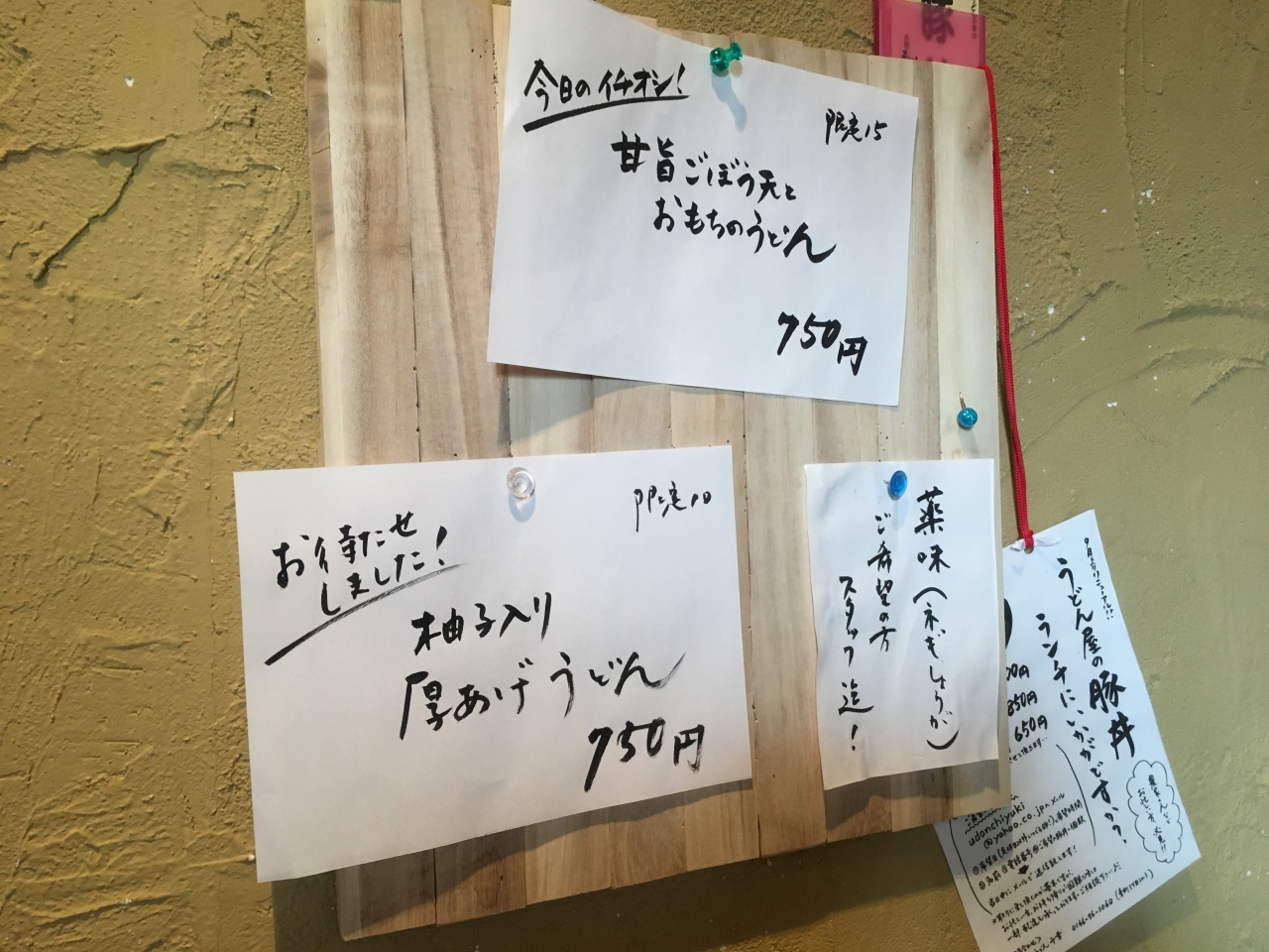 お店に入ってから、限定15食の「今日のイチオシ 甘旨ごぼう天とおもちのうどん」がずっと気になっていたので、注文して、いただきました。