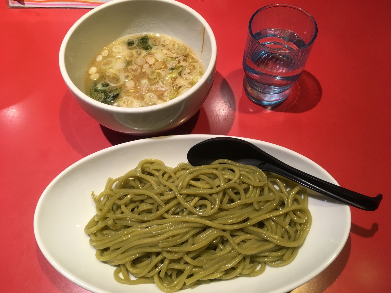 麺は、白麺、赤麺、緑麺の3種類が選べます。赤麺は唐辛子を、緑麺は明日葉を練り込んだ麺だとのこと。今回は、緑麺をいただきました。麺は太麺でコシがあって、美味しかったのですが、醤油味のスープは、しょっぱかったです。