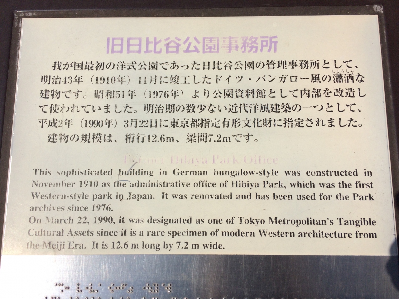 日比谷茶廊の横にある、かわいらしい建物です。何度も通ったことがありましたが、今回初めて立ち止まって、良く見たら、旧日比谷公園事務所だとのことがわかりました。今まで、ずっと喫茶店だと思い込んでいました。- 旅行時期