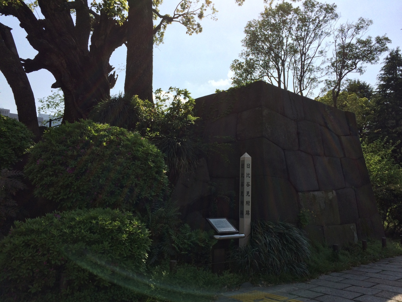 この石垣は、江戸城外郭城門の一つ、日比谷御門の一部です。