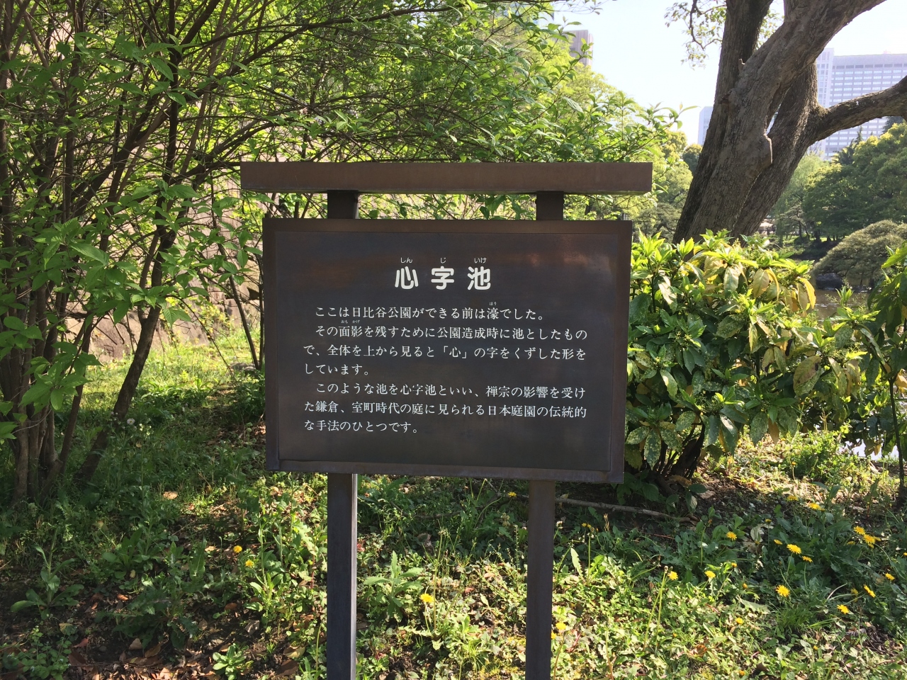 日比谷公園が出来る前は濠だったが、公園造成時に池としたもので、全体を上から見ると「心」の字をくずした形をしているそうです。