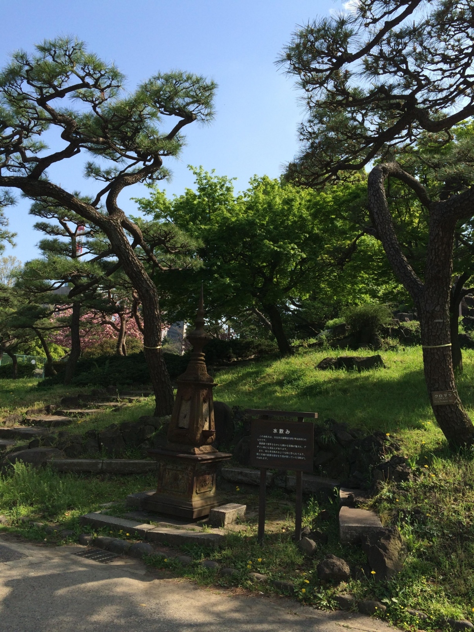 当時、石垣の西側は濠(ほり)となっていましたが、公園造成時の面影を偲び、心字池(しんじいけ)としました。