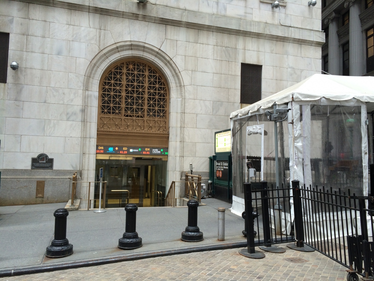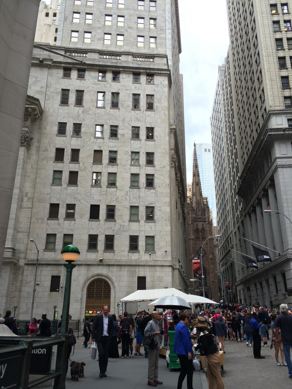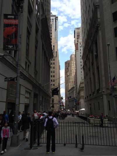 Wall街エリアには、観光客がたくさんいましたが、証券取引所の前でカメラを構えている人があまりいなくて、それに、バリケードで証券取引所に近寄れないようになっていたので、株価の電子掲示板を発見するまで、気づきませんでした。私が見つけなかっただけかもしれませんが、目立つような標識などがなくて、えー、ここなの?って感じでした。