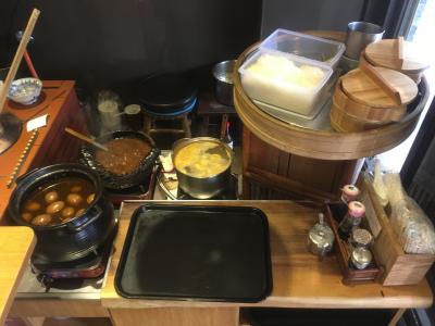 おかずは一皿ずつラップで包んであります。食べたいものを選んでトレーにのせ、奥へ進むと調理場があります。そこでスタッフが電子レンジで、温める必要のあるおかずを温めてくれます。その間、ご飯や味噌汁を選びます。