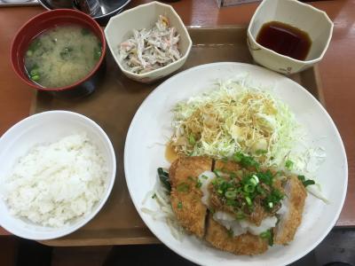 今週のワンコインランチは、ロースかつ和風おろし定食です。食券機で食券を購入してから席へ。お支払いは現金のみ。ワンコインランチだけどご飯の量を少なめにしたので、480円になりました。