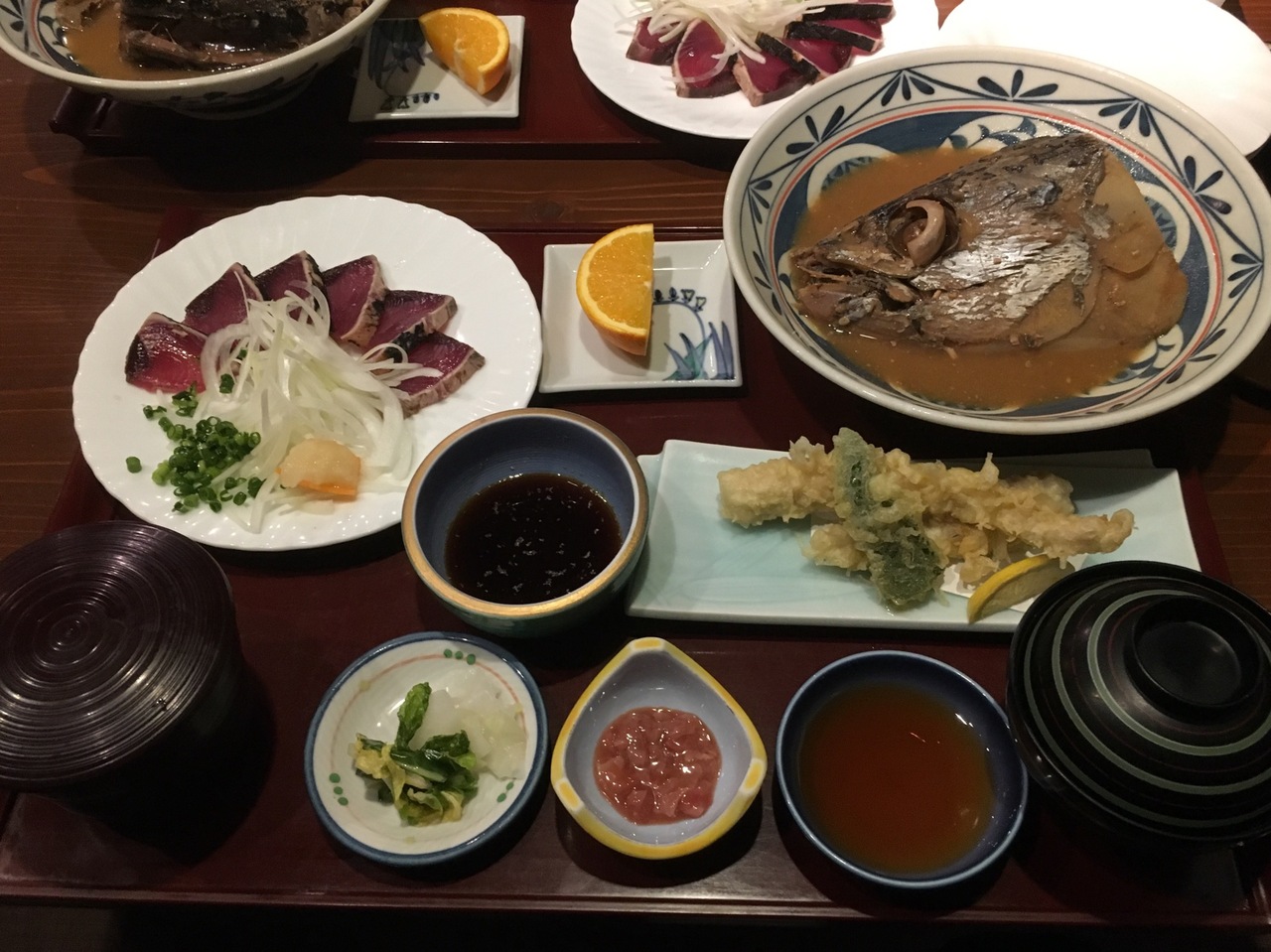 メニューはすべてがカツオ!お頭の煮つけ、カツオのたたき、腹皮(枕崎の地方言葉で腹の身の部分)の天ぷら、カツオの塩辛などが並んでいました。
