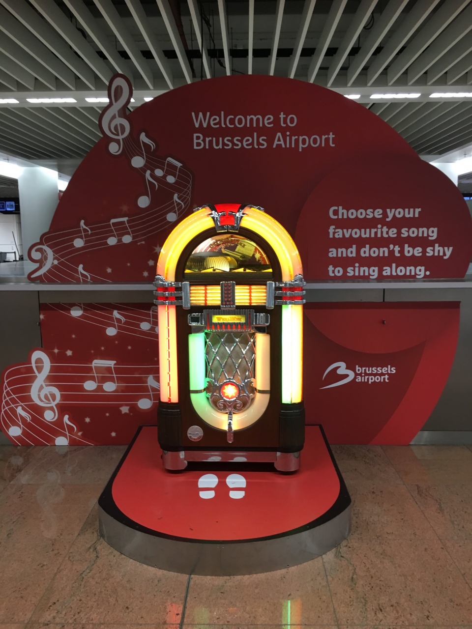 帰る際もブリュッセル国際空港を利用。出発フロアは到着フロアにくらべ広く、とても明るい。保安検査場の内外ともに飲食店やコンビニがある。保安検査場行く手前にもう1つゲートがあり、搭乗券をスキャンしないと入れない。