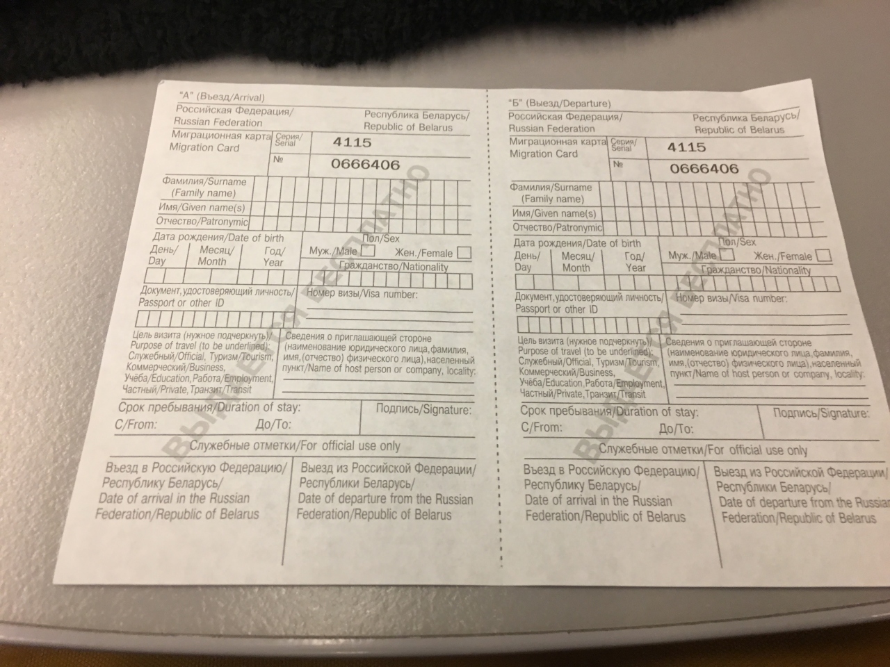 フィンランド国鉄(VR)車内検札→フィンランドの荷物チェッカー→フィンランド出国審査官→ロシアの荷物チェッカー(緑制服)→ロシア入国審査官(黒のベスト)という順番で回ってくる。また通貨両替人もまわってくる。VR職員からロシア出入国カード受け取り、国境越えるまでに記入する。ロシア出国時まで紛失厳禁。荷物チェックは個数を聞かれる程度だった。ロシア側で入国審査官にパスポートとビザ、出入国カードを渡す。半分切り取られて返される。特に質問はなかった。