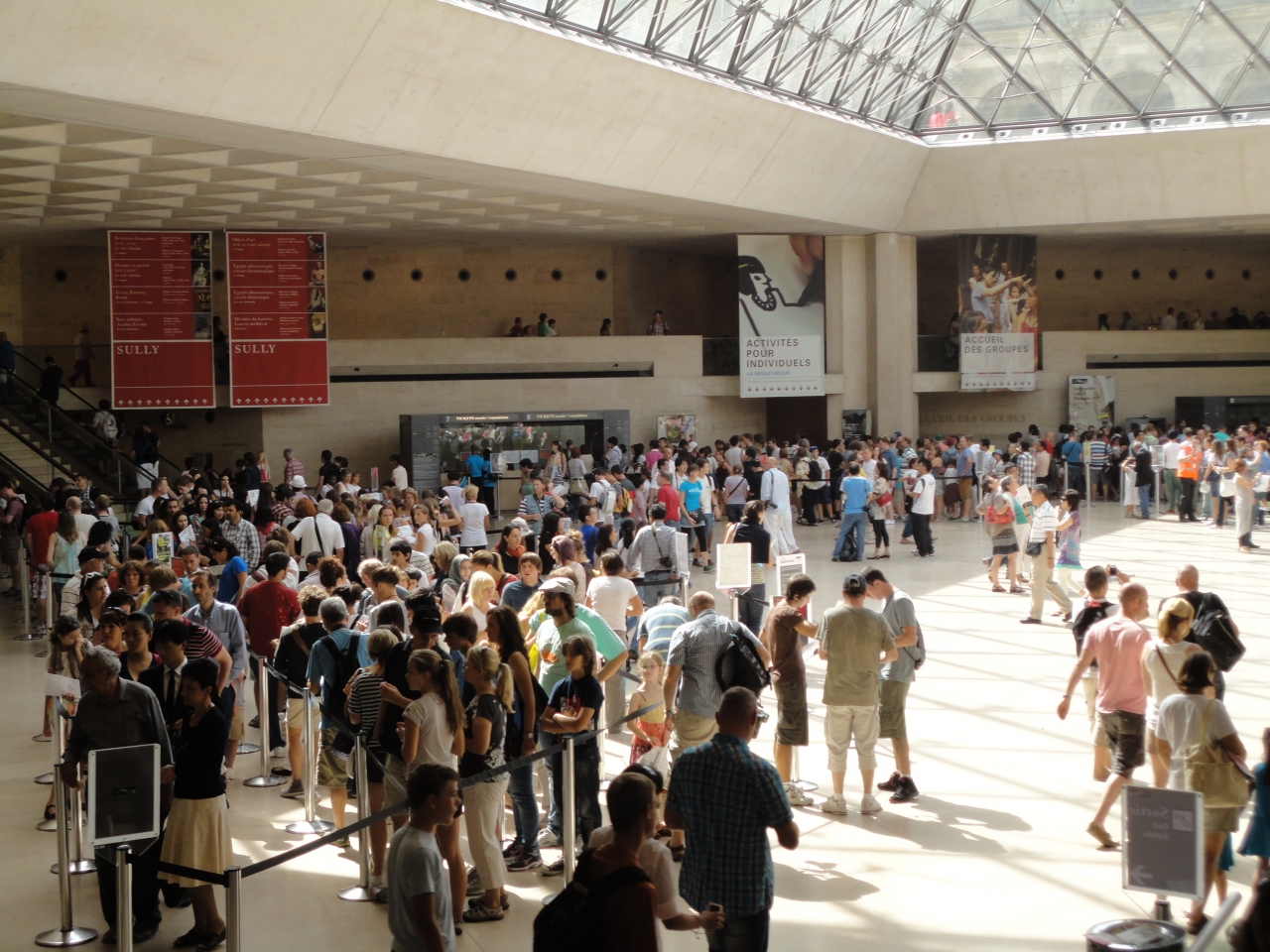 8月22日にルーブル美術館へ行きました。前日は、オルセー、ロダン、コンセルジェリ、サント・シャペルとかなり、忙しい1日でしたので、22日はゆっくりルーブルで過ごそうと考えていました。サンジェルマン地区のホテルでしたので、徒歩で7分。あらかじめ旅行書で「ポルトデライオン」に目を付けていましたが、本当に穴場のエントランスです。誰もいませんでした。即入場でき、入ると「モナリザ」への近道が示してあり、それをたどっていくと、無事「モナリザ」にたどり着くことができました。地図を片手にいろいろな名画を探しましたが、本当に広い。何度も迷ってしまいました。7時間ほどいましたが、力作の数々が重たくなり2時間ごとにカフェでお茶をして、リフレッシュした体でまた、名画を探しました。堪能できました。