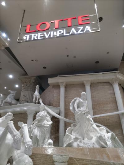 ロッテ百貨店 センタムシティ店は新世界デパートの入り口と隣り合っていて大型デパート二つがすぐそばにあって便利。ただロッテは西面のお店のほうが買い物はしやすい。あと新世界がすごい広いのでどうしてもくらべてしまう。LOTTE TREVI PLAZA(ロッテ トレビ プラザ)という白亜のローマ建築みたいな像のおいてあるスペースがあり、その周りにはベンチもあってちょっと休憩しやすい。