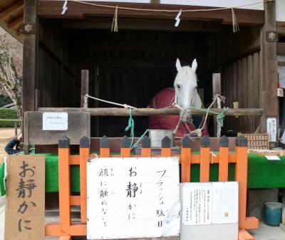 京都駅からバスでいきました。お正月だけあって、混んでいました。バスの運転手さんいわく、あと1区間がすすまないというお話で手前で降りる人もおおかったです。ほんと車の渋滞がすごいエリアです。なかすすむと入口付近に白馬がいます。写真はOKですがフラッシュはNGですので。餌を有料であげられますが、馬の鼻息がすごくて歯もすごくてちょっと腰が引けました。でも白馬をちかくでみられます。京都でもっとも古い神社であり、雷(いかづち)の御神威により、厄を祓い あらゆる災難を除き給う厄除の神社として有名です。