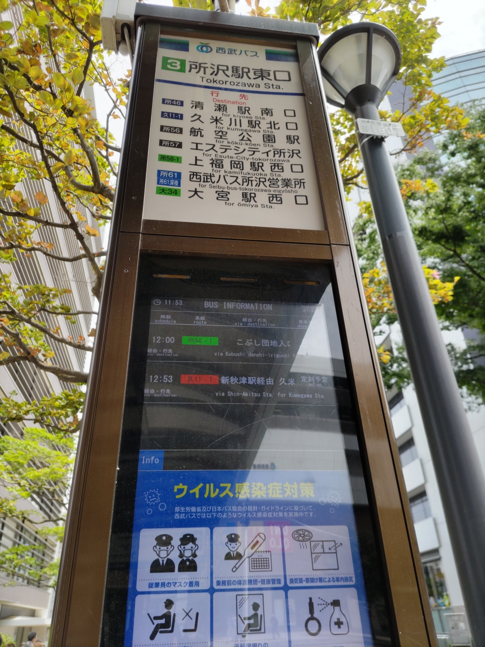 所沢駅から乗りました。東口にバス乗り場があり、表示などとても分かりやすかった。またバス停には電光表示で次のバス、その次のバスをお知らせするシステムがあり、そのためよりわかりやすかった。都内在住だと一律なので前からのって後ろから降りるのが都内の一般的な都バスなどののりかたですが、所沢のこの西武バスは後ろから乗るときにパスモなどタッチして、降りるときには前の出口からパスモなどタッチするやりかた。