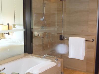 バスルームとかもゆったりしたつくりになっていて上品な設えのホテルです。交通の便がちょっと駅から高台にあるので、眺めがよいけど、その分、のぼりを自分であがると大変なので、車移動がおすすめです。送迎バスもあるので、それをうまく利用するのがおすすめ。隣のエリアに、免税店もあり、ただそこそこ離れているので免税店とホテルはまったく別の建物なのでご注意を。雨降ったら貸さないとちょっとしんどいという距離です。ホテルのバスのアメニティもこだわっていたりします。ただちょっと暑い時期、夏の季節はプール目当てで結構ご家族連れの利用がおおくて、そのあたりにぎやかになっている。