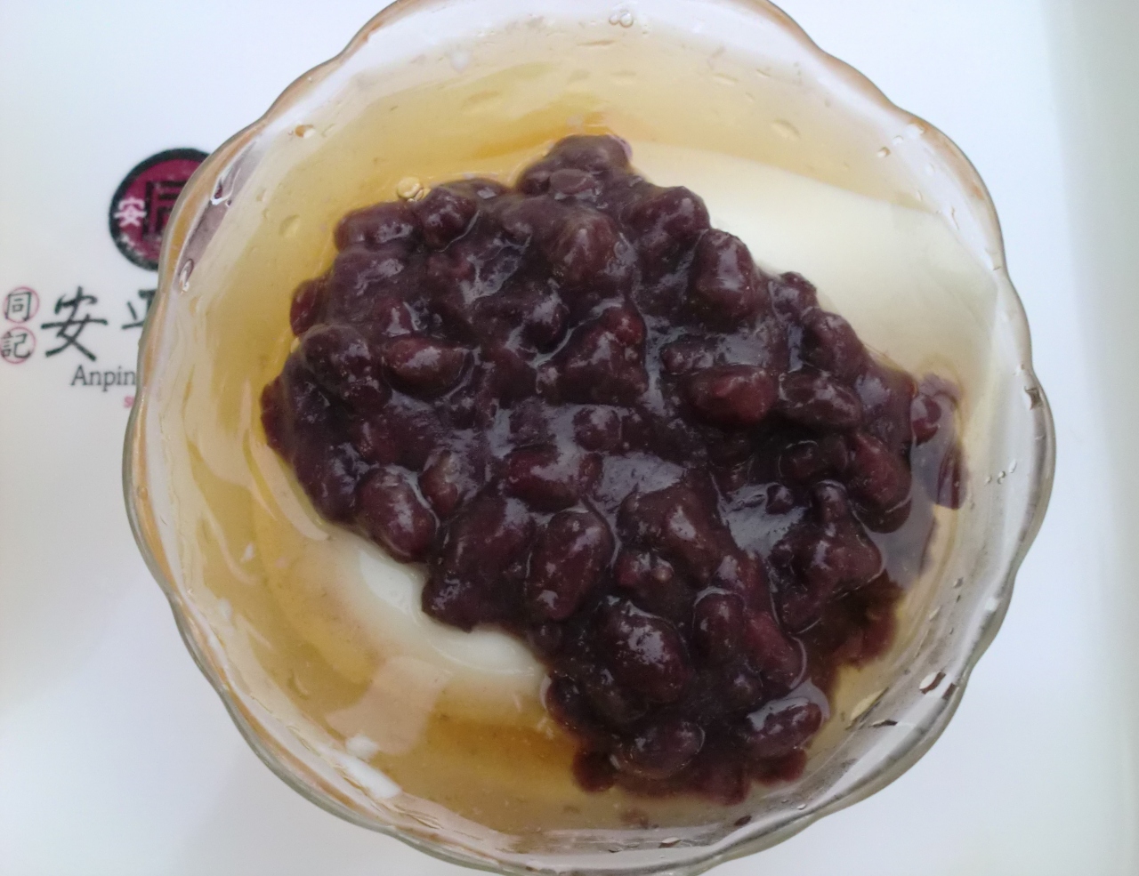 老舗の有名な豆花店です。白豆花という普通の白いタイプのものを選びました。鮮奶豆花(白豆花+牛乳)とか黒豆花(竹炭入り黒豆の豆花)もあります。そしてトッピングとしてあずきを選択。豆のおいしさを感じるお菓子でつるっとしていて食べやすい。