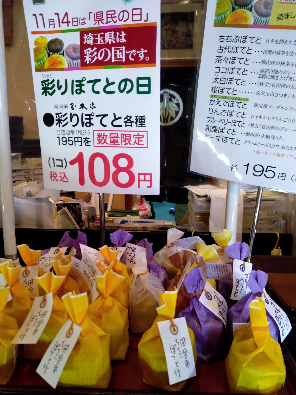 彩りぽてとシリーズがこのお店の売りのようで種類がいろいろありました。また11/14は埼玉県民の日。そのため195円(税込)の商品がセールでお安くなっていて、皆様かってました。本店のこちらのみのサービスのようでした。抹茶味、メープルなどお安いのでいろいろ食べ比べにかいました。でもどれもそんなに味の主張がつよくないです。日持ちも一か月程度持つので便利。