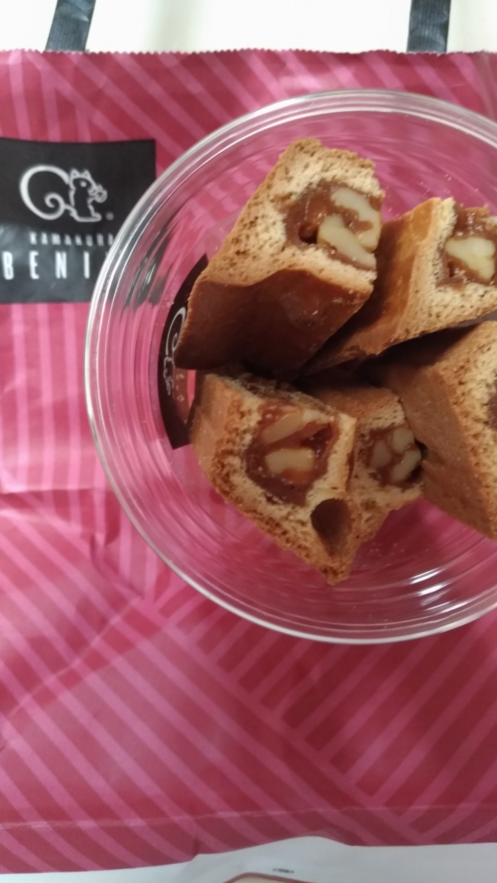 日曜の午前ですが、すいてました。並んでいる人はだれもいなかった。手前がおかしの販売コーナーですが、誰もいなかった。奥がカフェですが、お茶している人はいたが並んでなくて、すいてました。くるみっこの切り落としは、手前の販売スペースでなくて、奥の喫茶のほうで販売しているのでそれを購入。袋も無料でくれました