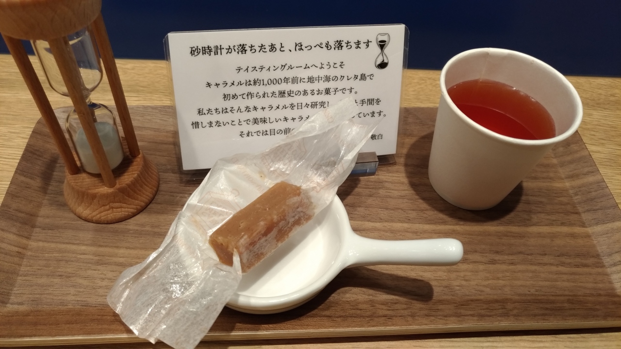 店内は販売スペースのほかに、おくが立ち食いスタイルのイートインスペースがある。100円でキャラメルテースティングができるのでやってみた。15名限定。ただ自分家族以外ひとがほぼいなくて、密にならずにたべれた。100円でキャラメル一つと小さな紅茶がついてます。グラニースミスのリンゴをつかったアップルシナモンのキャラメルおいしかった。
