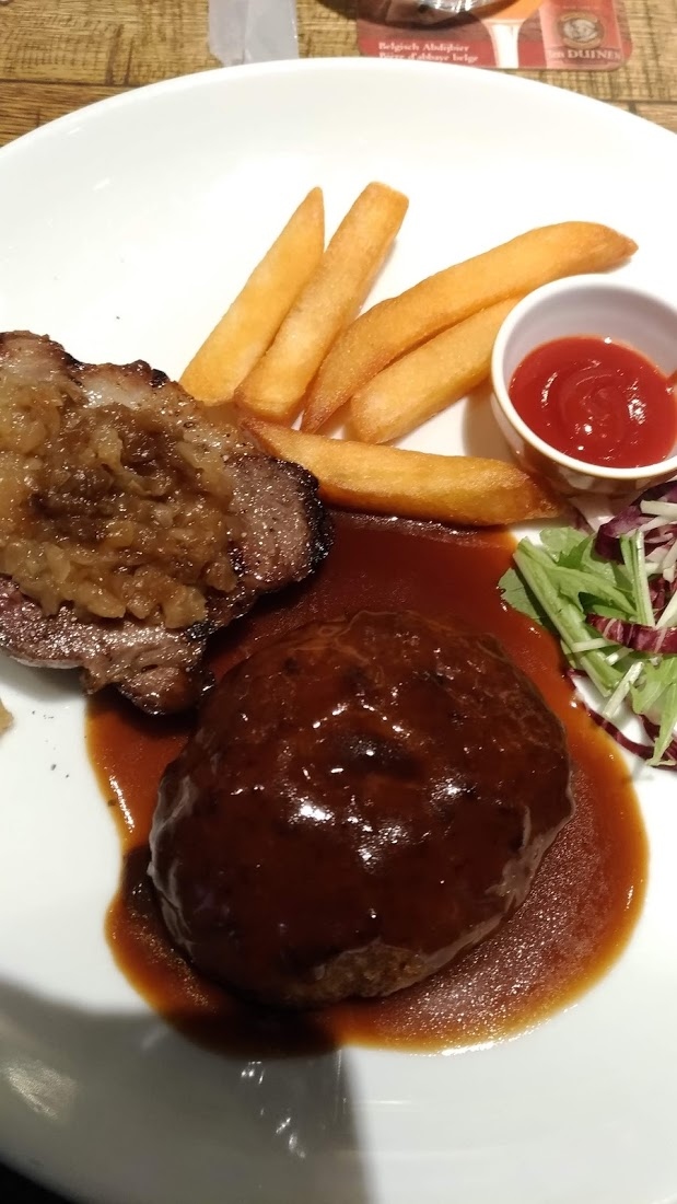 ランチで伺いました。ちなみにGO TO EATの対象店舗のようで一応予約してからいきました。コロナも考えて、一人ランチ。天気がすごい悪くて、通常はここはオープンエアになっているのですが、入口だけはあいてましたが、さすがにほかしまっていた。11時代にいったので、すいてました。予約しなくても十分入れる。岩手県産牛と白金豚の格之進ハンバーグ200gとイベリコポークジンジャーとオーダー。格之進ハンバーグ楽しみとおもっていたのですが、イベリコポークジンジャーのほうがおいしかった。