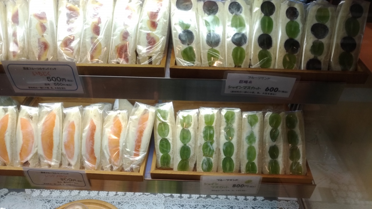 まるごとにっぽん2階にあるお店。サンドイッチのショーケースがあり、奥がカフェスペース。今の季節はブドウやいちじくなどがつかったフルーツサンドイッチがいろいろ。一番高いのはシャインマスカットサンドイッチ。すべて1切れですが、800円です。