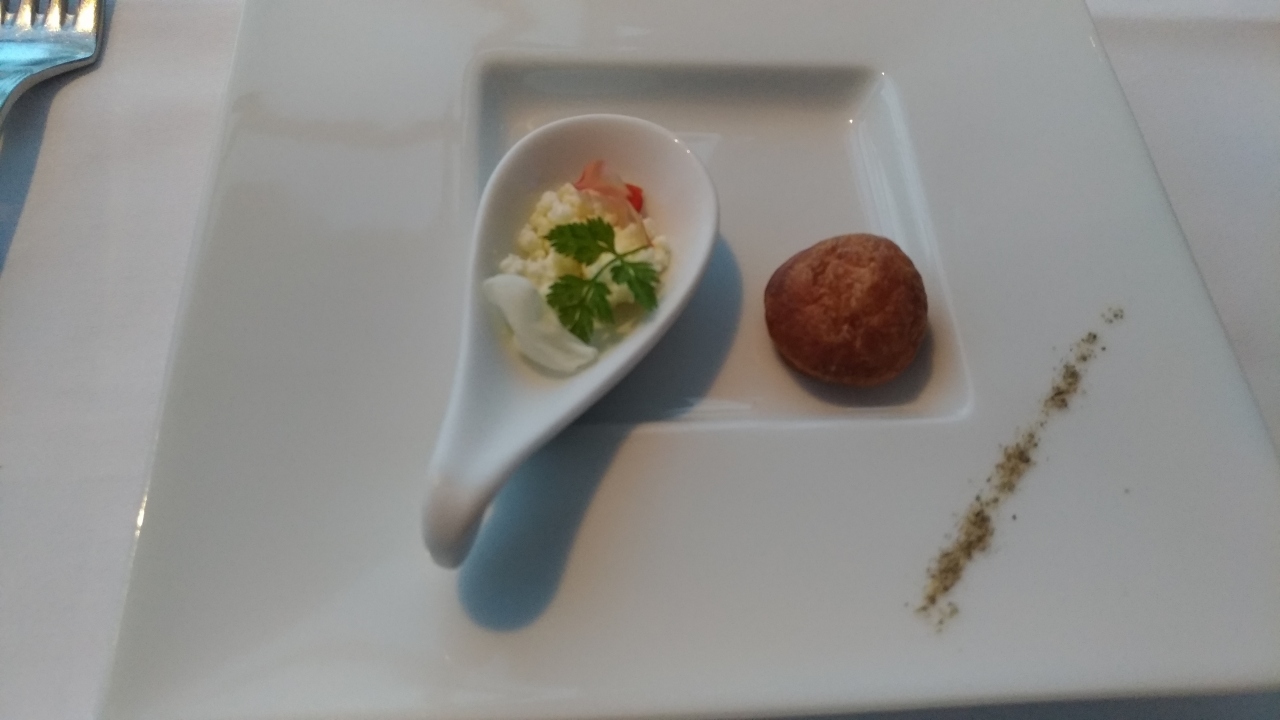 フレンチのお店で窓が大きくて、ちょっと距離がありますが、海がみえる。コロナ対策でテーブルの間隔は結構あるし、天井もたかくて、密にならない感じで食事ができた。