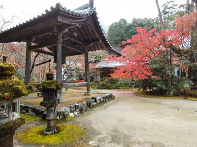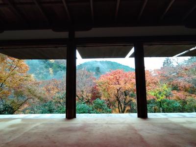 京都の紅葉名所としても有名なところ。そのため祝日だと混むかなと思い、混雑を避けるように二条から直通バスがあり、それでいきました。雨で結構降っていたのでそのせいもあるが、渋滞もなくて8:50のったら9:20ごろには到着。チケットは事前にかってあるし、ひとはいるが、すくなかった。バス停からあるきます。団体客の人があとから来たが、どうも階段などのぼれなくて脱落しているようだった。かなりあるくので小さなお子さん連れとか無理につれてくるのはおすすめしない。大人で歩けるひとでないときびしい。雨の紅葉はしっとりしてきれいでした