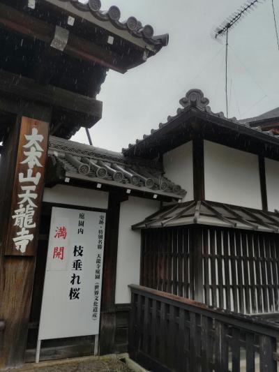 嵐山の中心地にあるお寺。とても広さもあり、お庭が有名。天気がとてもわるくて、雨なのが残念でしたらが、入口 に枝垂桜 満開の文字がありました。名勝嵐山や渡月橋、天龍寺の西側に広がる亀山公園などもかつては境内地であったぐらいの歴史あるお寺