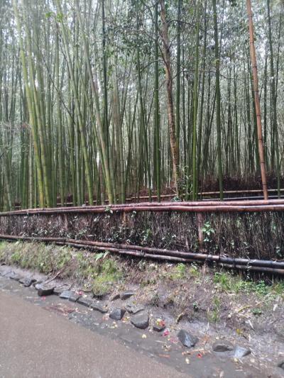 無料で見学できるエリア。日曜の午前でも雨のため、人がいるけどこみこみというほどではなかった。やっぱり雨だとより薄暗い感じになります。でも竹の青々とした感じはすがすがしく感じる。人力車などもこの辺よくとおります。