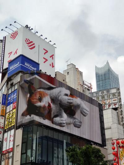 新宿駅JRから徒歩1分の東口スクランブル交差点に面する街頭ビジョン。3Dの立体的な 巨大猫が決まった時間にあらわれます。かなり大きなねこちゃんだし、立体的なのがすごい。みなさん写真や動画をすごくとってました。