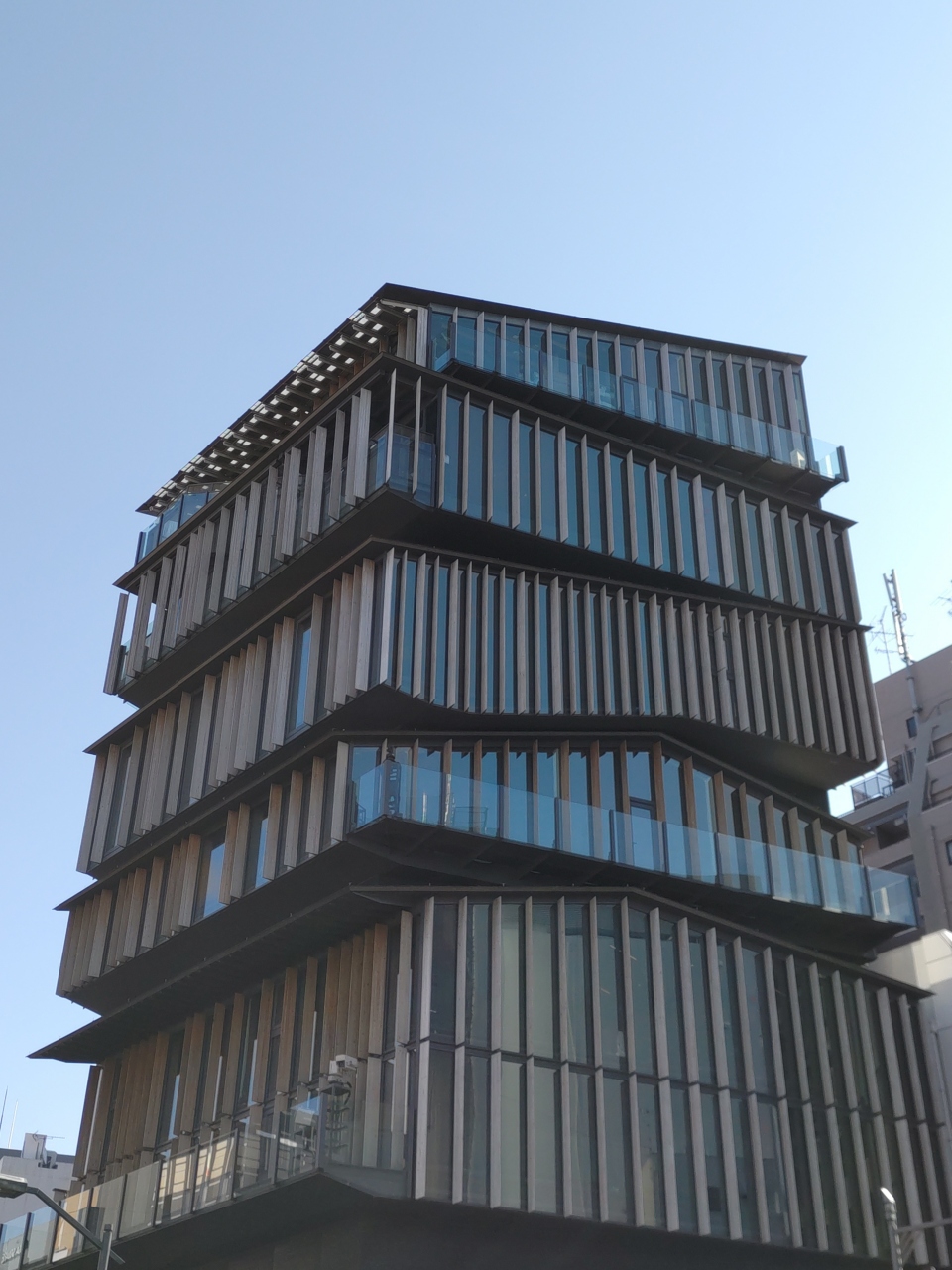 隈研吾氏のデザインで、観光案内所、会議室、多目的ホール、展示室という目的のビルになっています。とっても特徴的なデザイン。木製ルーバーがたくさん取り付けてあって、格子みたいなデザインで、木造住宅を7つ積み重ねたような組あせた変わったデザインです