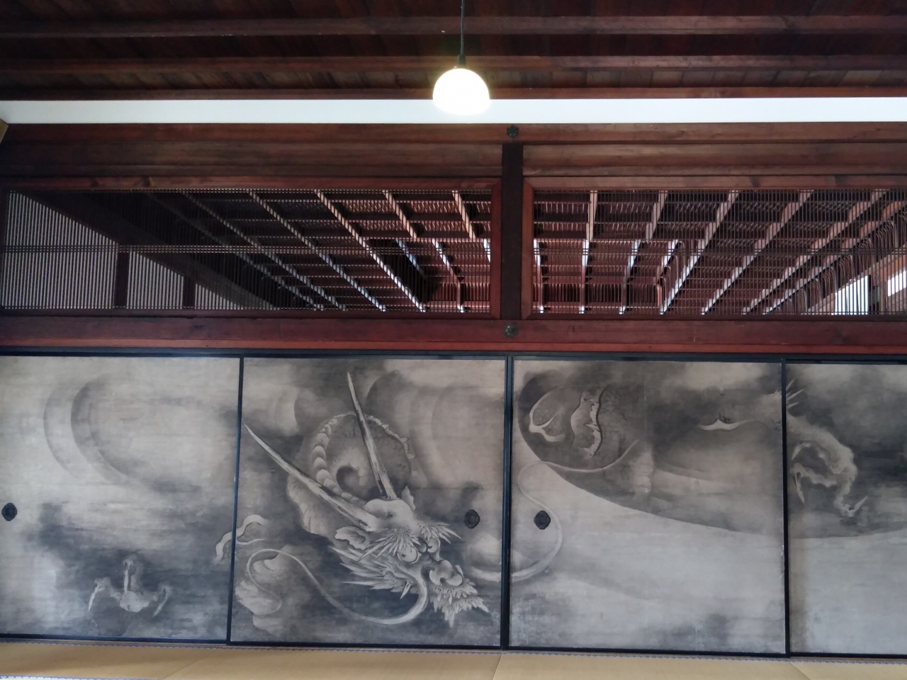 大きなお寺というわけではありませんが、展示の絵がすごくインパクトのあるものが多くて印象に残ります。「東山安井」のバスで徒歩5分ぐらいで、このあたり花見小路にも近くて京都らしい町並みのお店もすぐあります。結構京都はお寺への移動に時間がかかることがあるが、こちらはとても立地も便利。襖に墨を使って大きな龍と流れるような雲を描いた「雲竜図」。天井の龍の絵もすごいですし、、国宝の「風神雷神図」もレプリカでもインパクトあります