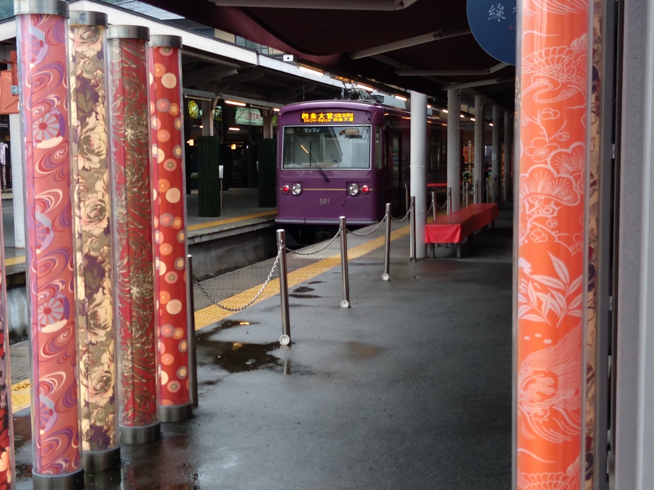 路面電車で大きさもこじんまりしている電車。嵐電・嵐山駅は京都らしい友禅をつかったポールが約600本を林に見立て、駅空間の中にあります。駅も路面電車なのもあって、フリーで開けている感じ。電車もレトロな雰囲気でよい