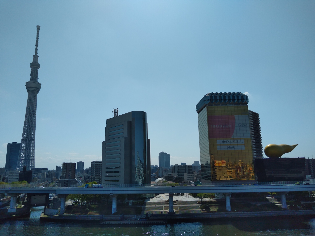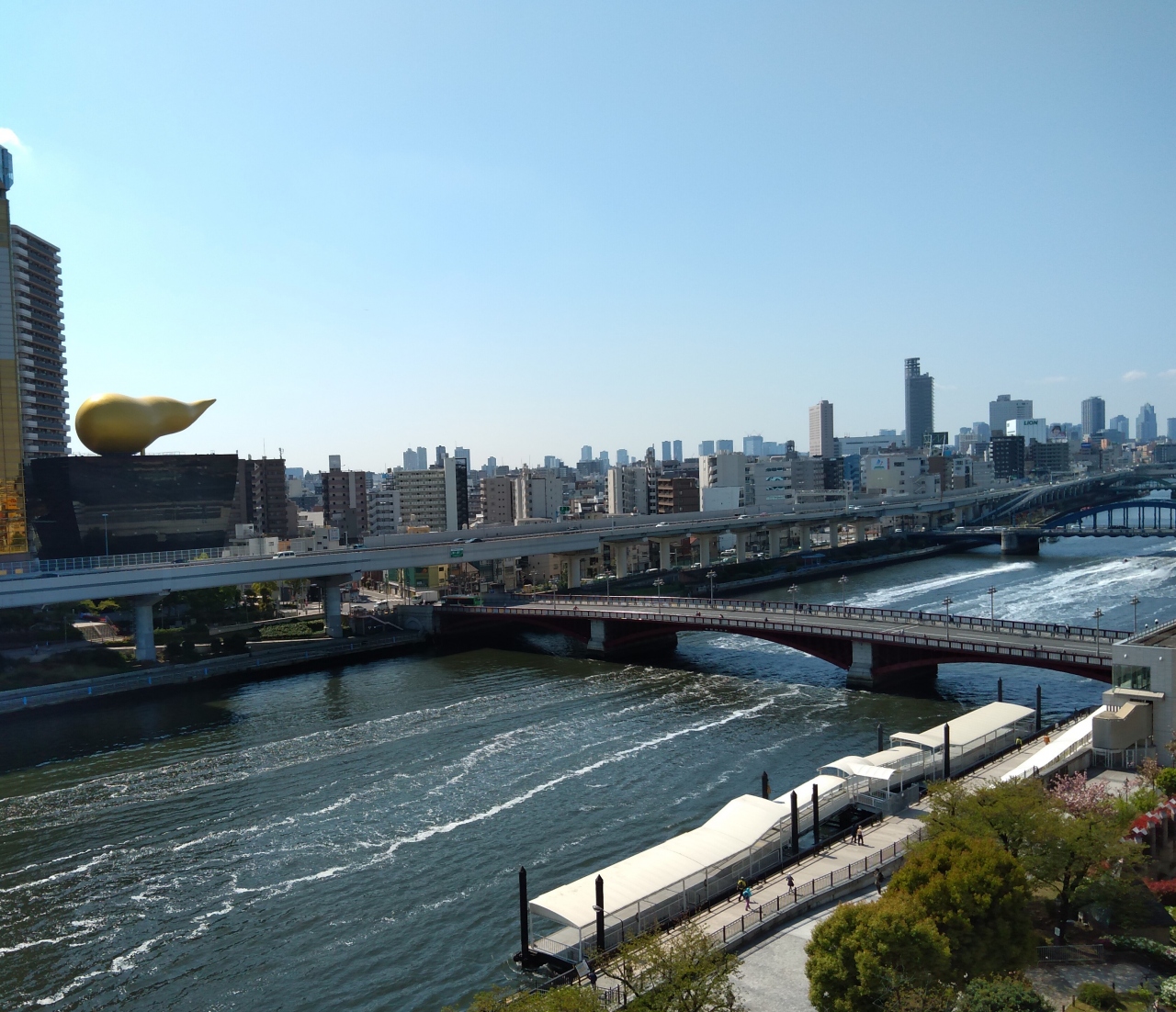 ちょうどこの川はさんで反対側のホテルに宿泊したので、よく見えました。ビールをイメージした外観のアサヒグループ本社ビル。色は金色にビルとしてみえるけど、琥珀色のハーフミラーガラスで、ビルの高さは100メートル