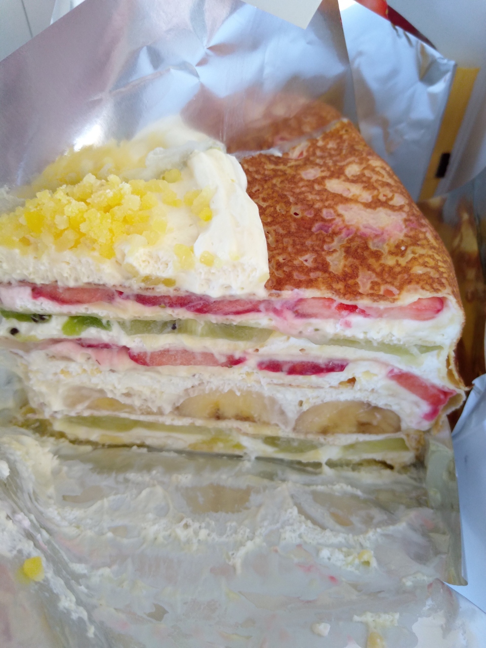 なんといっても店頭にあるショーケース。こちらはまったくのそとではないですが、テラス席もあって、開放的な感じのつくります。今回テイクアウトしました。フルーツたっぷりのミルクレープ。メロンとかもはいっていてジューシーでおいしい