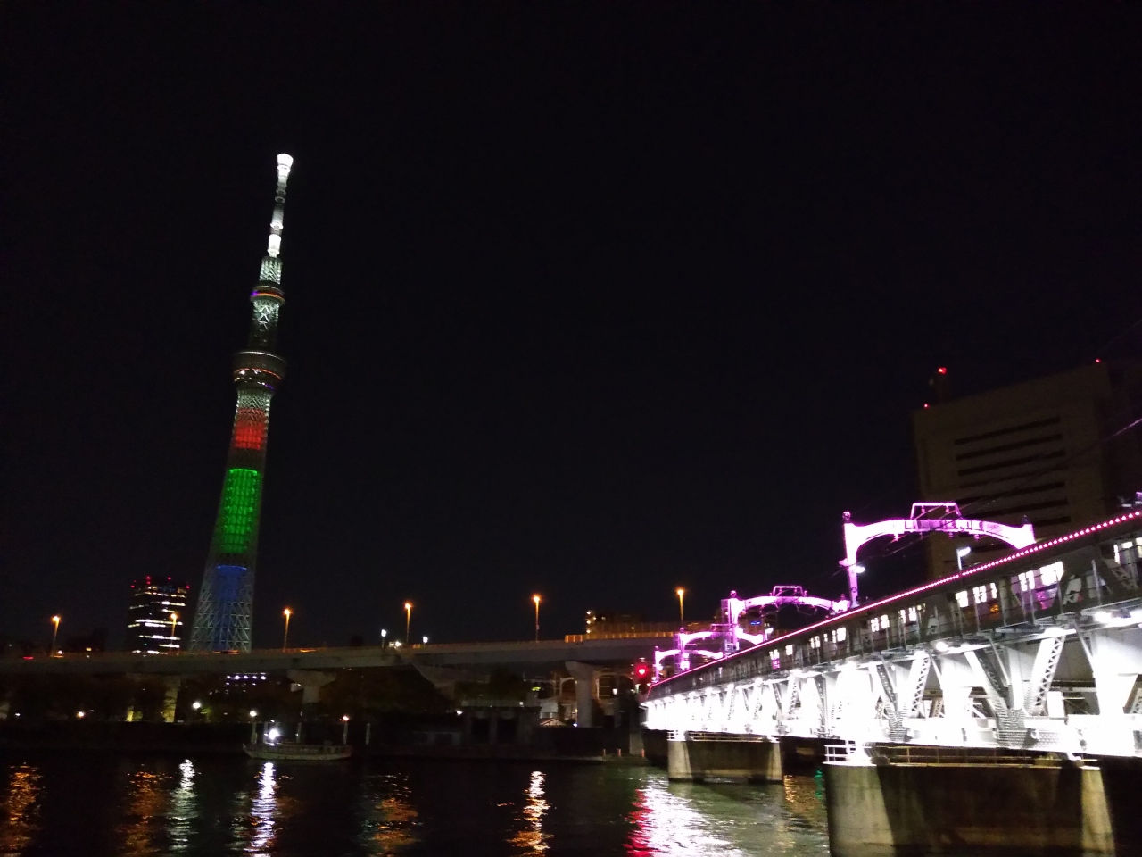 徒歩で浅草寺方面から東京スカイツリーまで最短で行くことができる、全長約160メートルの遊歩道内です。ガラス床もあり、隅田川の水面を覗くことができます。橋のカラーデザインは白ですが、日没になると点灯されて、橋のライトアップきれいでした。