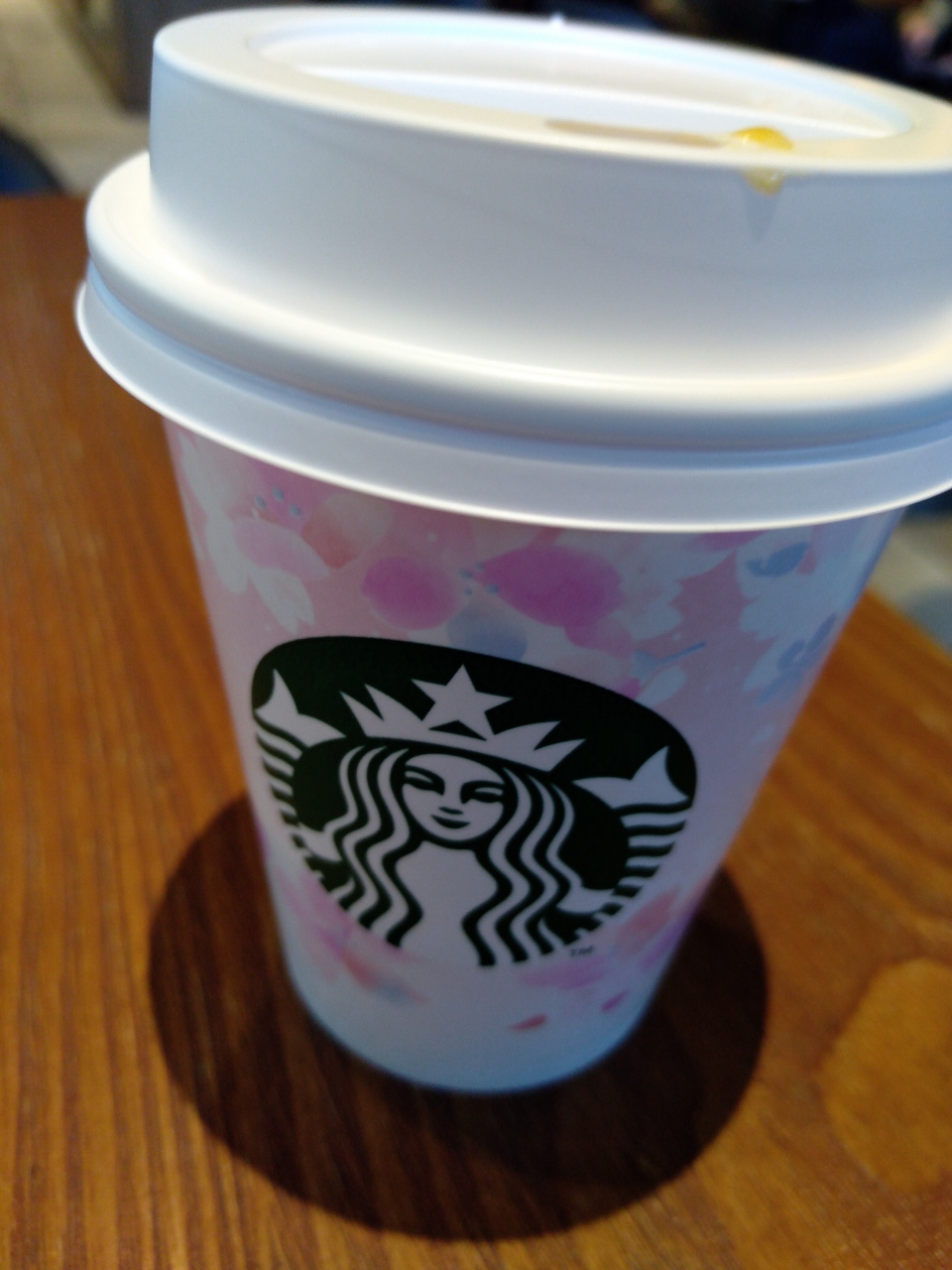 久しぶりにいきましたが、カップが桜模様になっていてかわいい。季節ごとにかならず変わるわけではないですが、ちょっと桜でうきうき。購入したレシート下のQRコードを読み込むと、満開の見上げるさくらか踊るベアリスタがスマホ内に登場というのがついてました。キャラメルマキアートにしましたが、まえはシナモンとか自由にかけれましたが、今はおいてなくて、スタッフにお願いするとかけてくれました。
