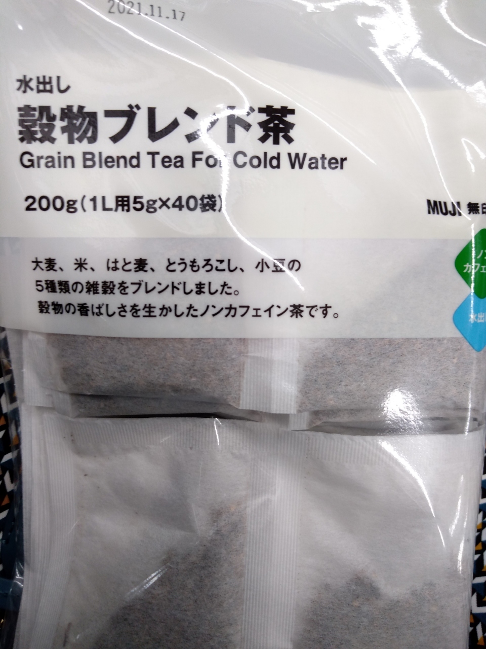 銀座の無印良品はかなり大きい。一階は食料品関係がうっていて、お茶の売り場も広い。いろいろ種類もありますが、穀物ブレンド茶 200g(1L用5g×40袋)を購入。なんといっても40パックはいっていて消費税込299円という価格が魅力的。水出しだけどお湯出しにしても別に問題ないです。