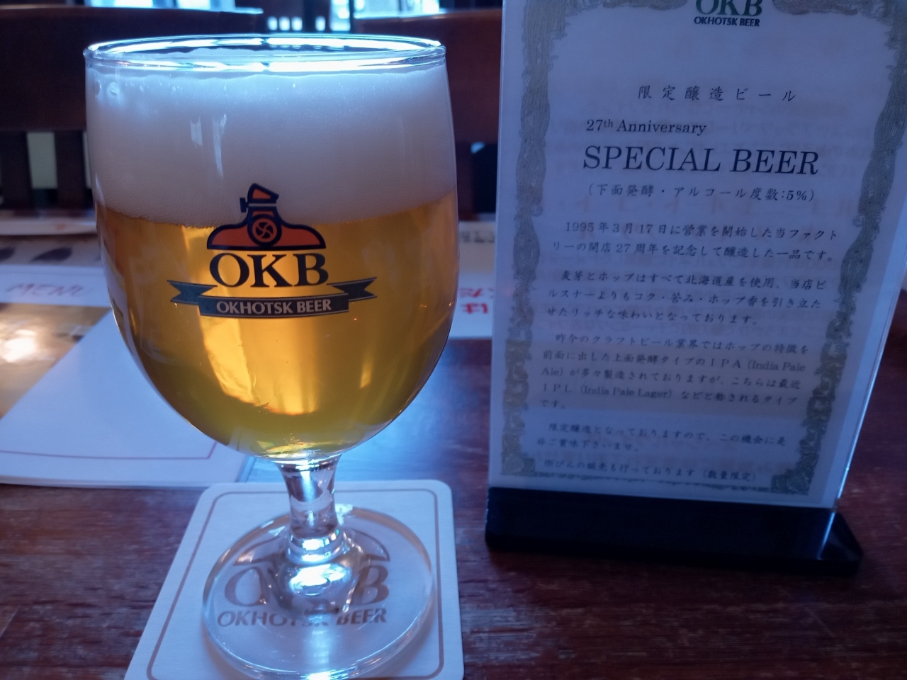 遅めの昼食兼早めのディナーをいただきました。忙しくて、お昼を食べそこなっていたので、少し早くてもビールを飲むことをお許しください。と言うわけで北見の地ビールレストランにやってきました。入ると右側にビールの煮沸釜が見えます。釜を見るとビールもおいしく感じるのはなぜなんでしょう。店内は、天井も高く豪華な感じです。店内には、私たちのほかには、お一人しかお客さんはいません。早い時間だからでしょうか。早速、ビールを注文しました。まずは、ろ過前のビールです。ここでしか飲めませんからね。一口飲むと、ビールの苦みとさわやかな香りが伝わってきます。そしてご当地グルメのオホーツク塩焼きそばを注文しました。大きなホタテが入っています。タマネギもたくさん入っていて、さすがホタテ、タマネギの産地北見だなと思いました。ビールもすすみ、忙しかった1日のご褒美には十分すぎるおいしさでした。