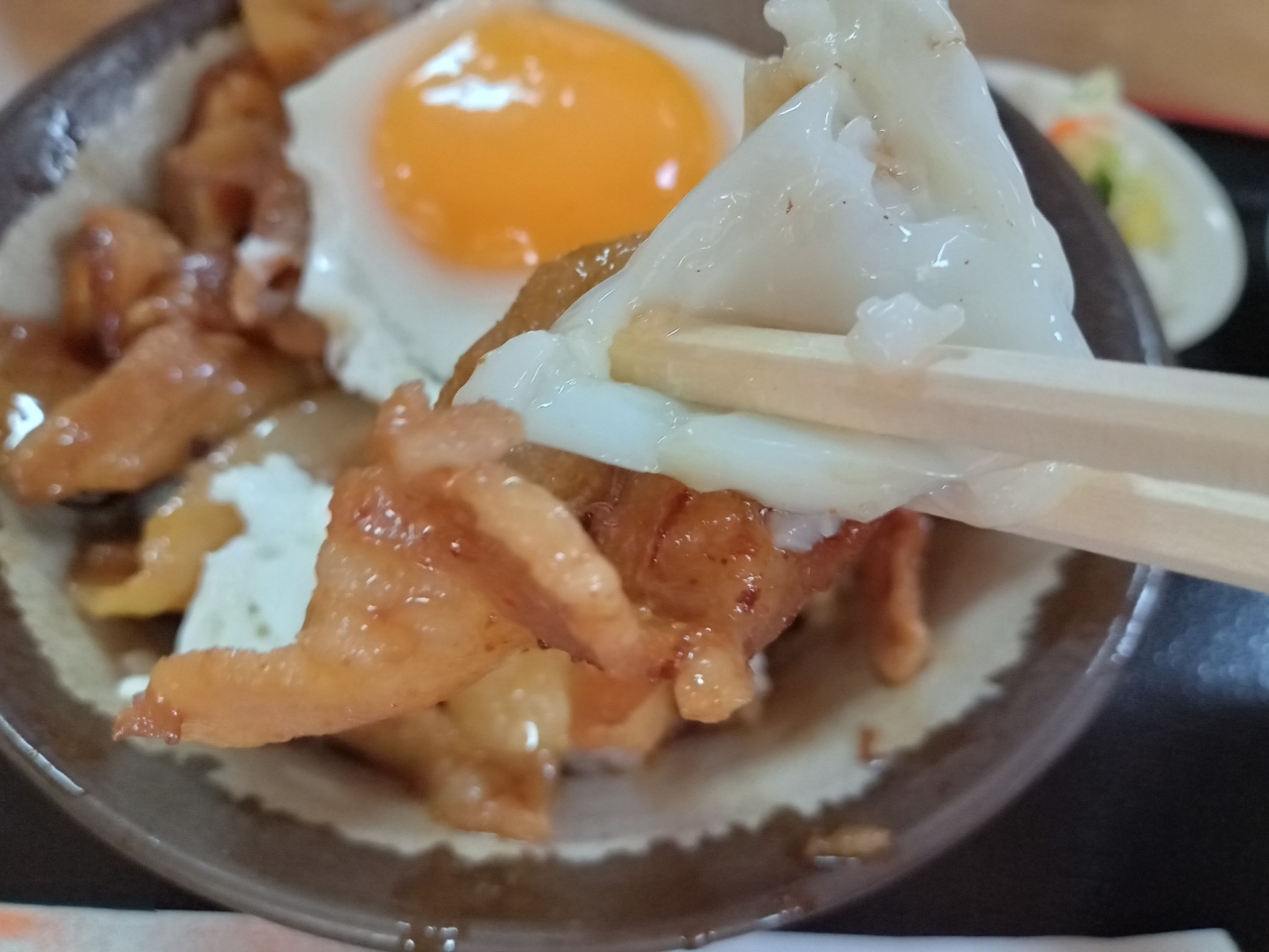 以前から行ってみたいお店が、滝川にありました。高田屋さんです。日本が元気だった昭和の食堂。時には、働く人がお腹を満たしに、また時には、家族で食事を楽しむために訪れたお店が高田屋さんです。ここの「チャップ丼」をいただきたいのです。店の前に立つと、建てられたころはかなりモダンな食堂だったことが玄関前におるメニューのディスプレーを見ると「お子様ランチ」があることからわかります。その「お子様ランチ」の隣にあるのが「チャップ丼」です。店内に入ると、タイムスリップしたかのような雰囲気に包まれます。実際、このような食堂に行った記憶は、ほとんどないのですが、なぜか懐かしい感じがしました。席に座って早速、注文。もちろん「チャップ丼」です。注文するとおかみさんが「目玉焼きつけると味がまろやかになっておいしいよ」と言います。それを聞くと試さずにはいられません。「チャップ丼目玉焼きのせ」を注文しました。やって来た「チャップ丼」は、タレの香りが食欲をそそるものでした。しっかりタレと一緒に焼かれた豚肉がご飯の上にのっています。そして、その上には目玉焼きが一つ。食べると濃いめの肉が半熟卵と相まっておいしさが倍増します。お肉の下には刻みのりもあり、脂っこさを中和してくれます。がっつり系メニューですが、女性でもペロッと食べられました。これも「目玉焼きをのせたらおいしい」と言ってくれたおかみさんのおかげです。大変満足しました。この次は「お子様ランチ」をいただいてみたいです。
