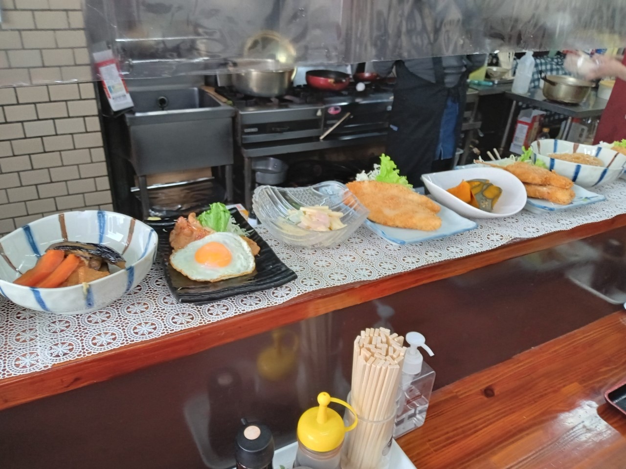岩見沢の駅でタクシーの運転手さんに教えてもらった食堂です。駅からは、歩いて5分ほどのところにあります。お店は、古いです。中に入ると、カウンターに、いろいろなおかずが並んでいます。焼き魚あり、カツあり、野菜炒めあり。目移りします。日替わり定食は、ここに並んでいるおかずの中から2皿、さらに小鉢も付くという大サービスぶりです。お店は3人の女性が切り盛りしていますが、奥にはご主人がおかずを作っているようです。種類も多く、これで1000円以内で済むとは、近くにあれば、毎日行きたい食堂です。