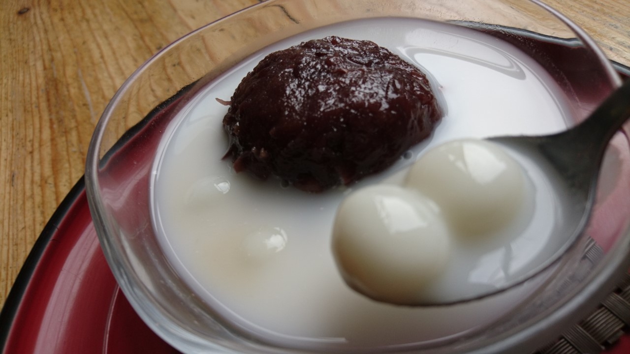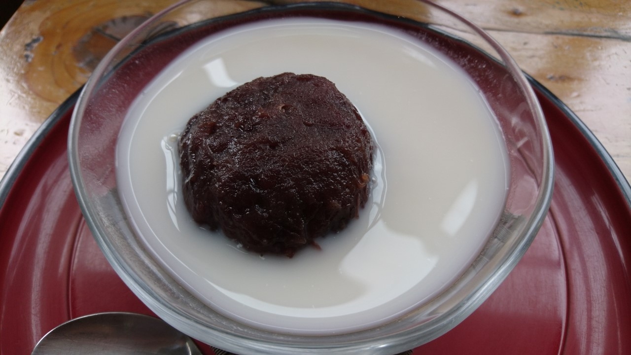 洞爺湖温泉街にある甘味処、岡田屋さん。こおの名物は「白いおしるこ」です。白い豆と牛乳を使ったおしるこということでこれを注文しました。真ん中に餡子も入った冷たいおしるこです。豆の味が伝わるおいしいおしるこです。白玉団子は、柔らかく、おしるこにあいます。温泉街で、こんなにおいしい甘味処があるとは、洞爺湖は良いところですね。