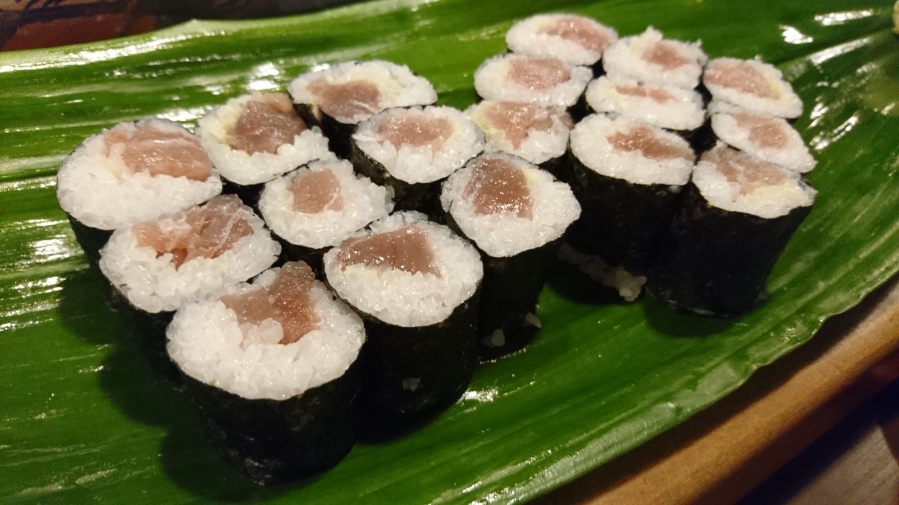 すすきのから外れたところでお酒をいただいて、ちょっとおなかがへったので立ち寄りました。以前も訪れたことがあるのですが、ネタが新鮮なのでお気に入りのお店です。ただ、この日は、ちょっとつまむ程度でいいかなという感じです。お好みで注文しようかと思い、鉄火巻きを頼むことにしました。出てきた鉄火巻きの量はとても多くびっくりしました。おいしいので全部いただきました。少し食べすぎかも…。会計の時、お母さんに「また来てね」と微笑まれました。また、来ますね。