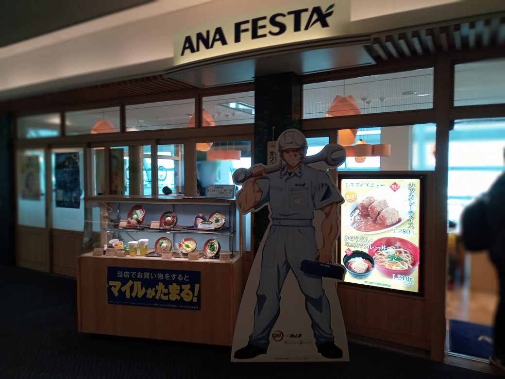 羽田空港の60番ゲートの近くにあるANAフェスタさんです。ここはおにぎりやうどんなど早く安くいただけるメニューがそろっています。おにぎりとからあげ、あまり具のないみそ汁がセットになったものもあって手軽にいただけるのがいいですね。目印は、鬼滅の刃の柱、宇髄天元です。子どももよろこびそうなお店です。