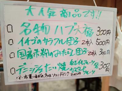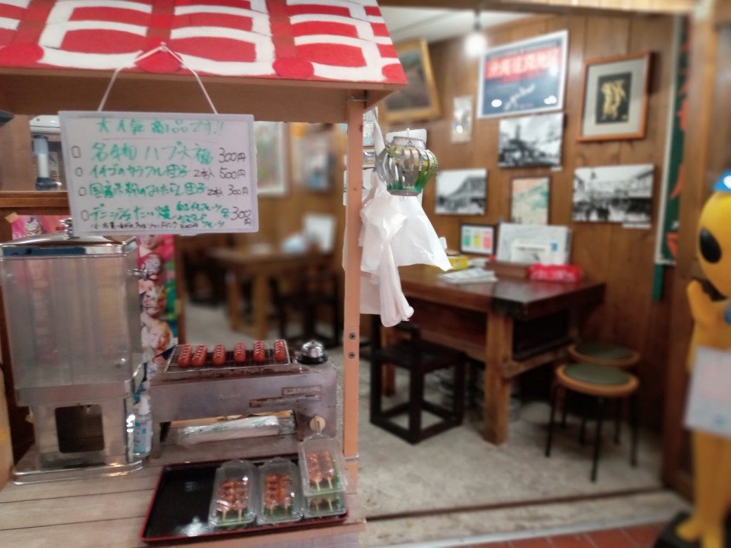 那覇の牧志を歩いていて見つけたお店です。昭和レトロ感満載のこのお店、その昔、薬局で見た佐藤製薬の象の遊具があります。象の遊具のわきには調剤薬局の看板がありますが、どう見ても調剤薬局ではない店構えです。よくみると「ハブ大福」なるものがありました。恐る恐る「ハブ大福」を注文しました。出てきた大福は、ハブのがイチゴを加えたかわいいものでした。ハブ酒のようにハブが入ったものではなく安心しました。「ハブが入っていると思った」と言ったら店にいたお客さんが大笑いしていました。すっかりお客さんとも仲良くなって良い旅の思い出になりました。