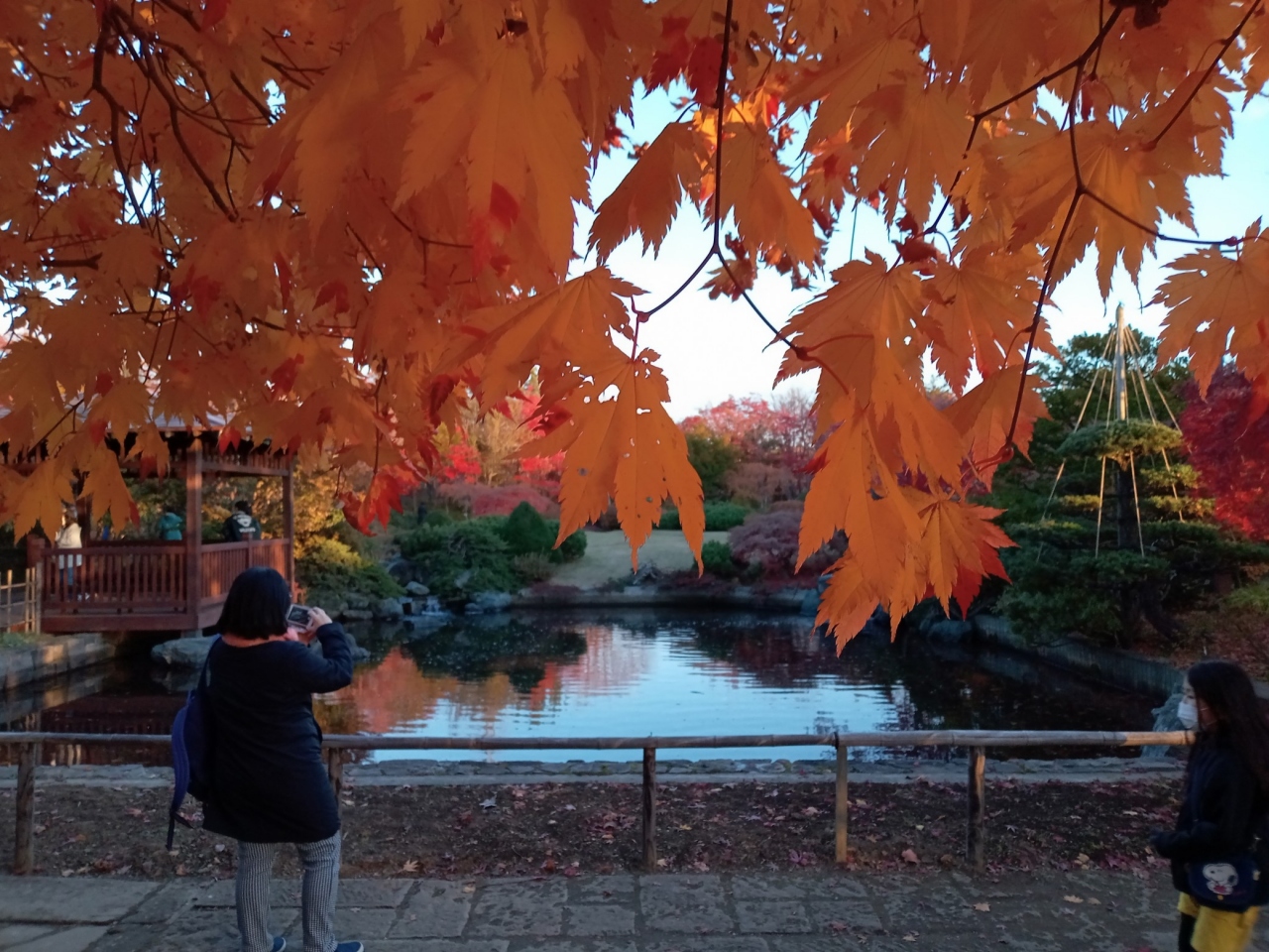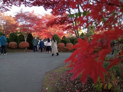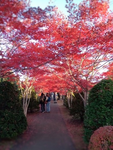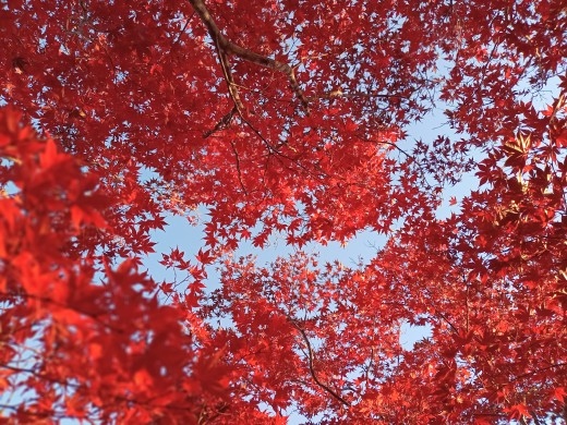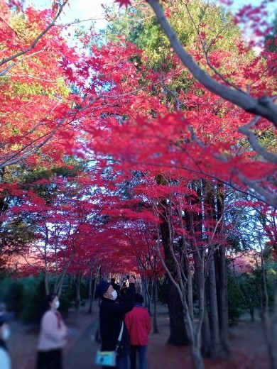 10年位前からでしょうか、平岡樹芸センターのモミジのトンネルが有名になったのは。それまでは、あまり人が訪れることはなかったのですが、秋になりと紅葉したモミジが道に覆いかぶさるようになりトンネルができると知られてからは、年々訪れる人が増えました。上を見上げると、当然紅葉したモミジが空を隠すようにかぶさっているのですが、地面も落ち葉で真っ赤なじゅうたんが敷き詰められています。秋の開園時間は、午前8時45分から午後5時15分までですが、秋は日が落ちるのが早いので、早めに行った方が良いです。