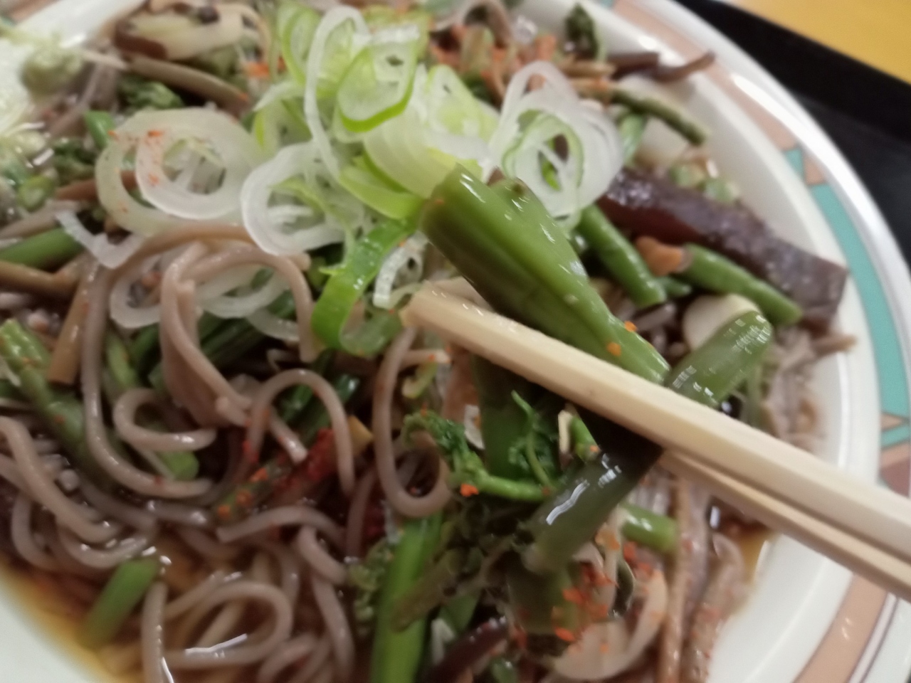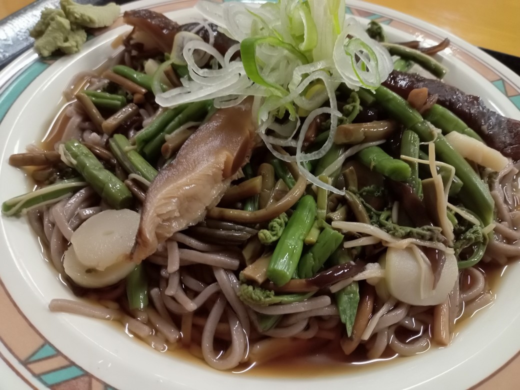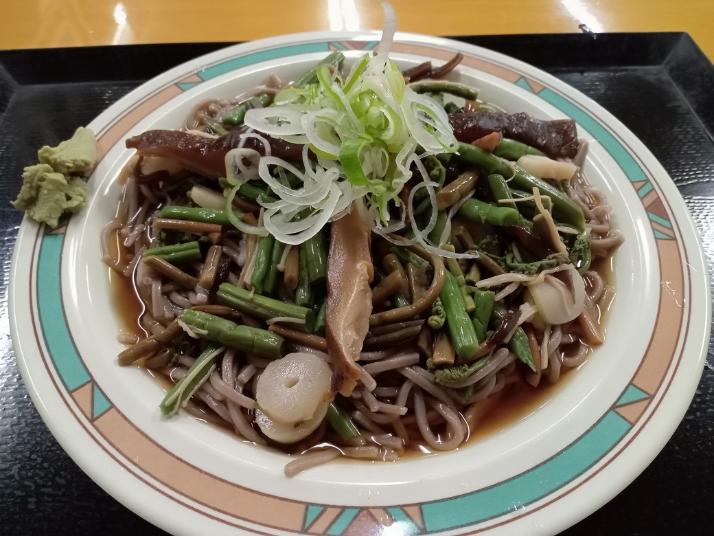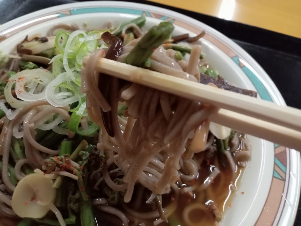 占冠の道の駅にあるお蕎麦屋さんです。道の駅には、個々のほかに洋食屋さんと、ラーメンや定食のある食堂の3店舗がありますが、洋食屋さんはお休み、食堂はやっているのかどうかがわからず、このお蕎麦屋さんにしました。仕方なく…。占冠に来たので、名物の山菜を使ったお蕎麦にしたのですが、蕎麦は、なんとなく伸び気味で、つゆも水っぽく感じました。外の看板に「10割蕎麦」と書かれていましたが、あまり蕎麦の風味を感じませんでした。早い時間だったせいか客はほかにいなく、寂しい感じでした。