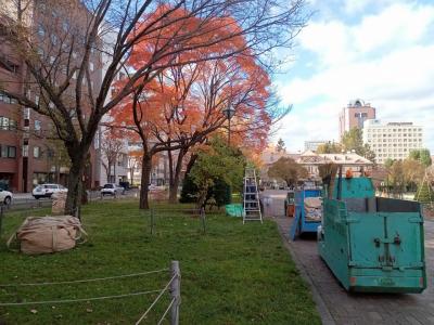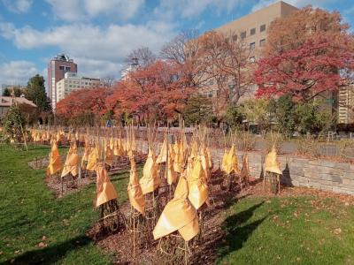 大通公園の一番西の端にあるバラ園。ここは、バラをはじめ、いろいろな花が咲きみがれる大通公園でもひときわ美しいエリアです。新型コロナウイルスが流行してから、ここにはずいぶん訪れました。近場の散策鹿でいませんでしたからね。訪れたときは、きれいなバラとその香りでたいへん癒されました。今回訪れたときには、来年に居向け冬囲いの作業が進められていました。また、来年、きれいな花、そしてすてきな香りで迎えてください。
