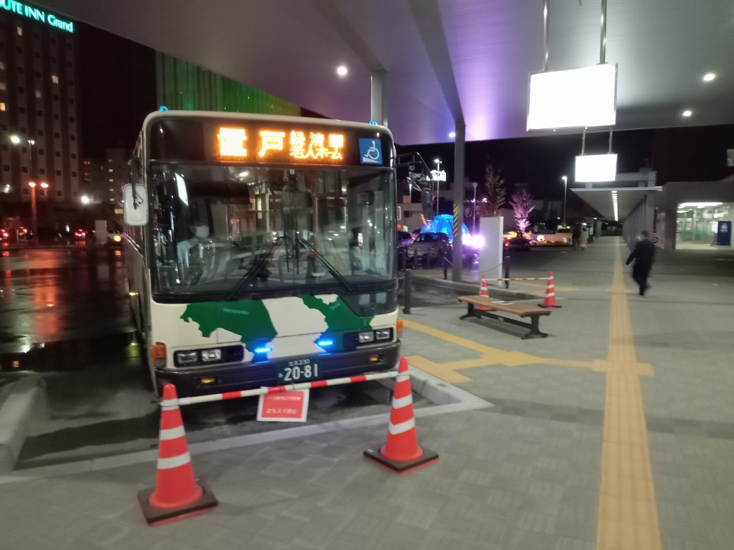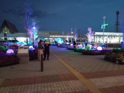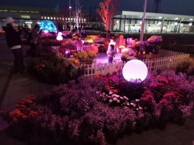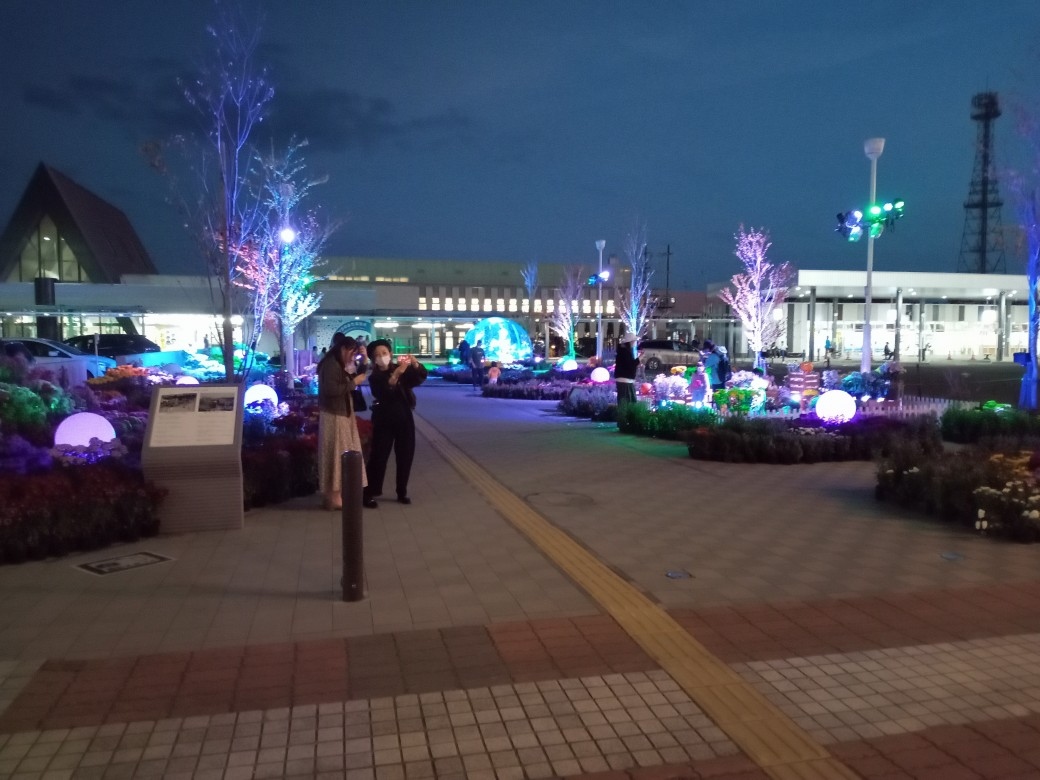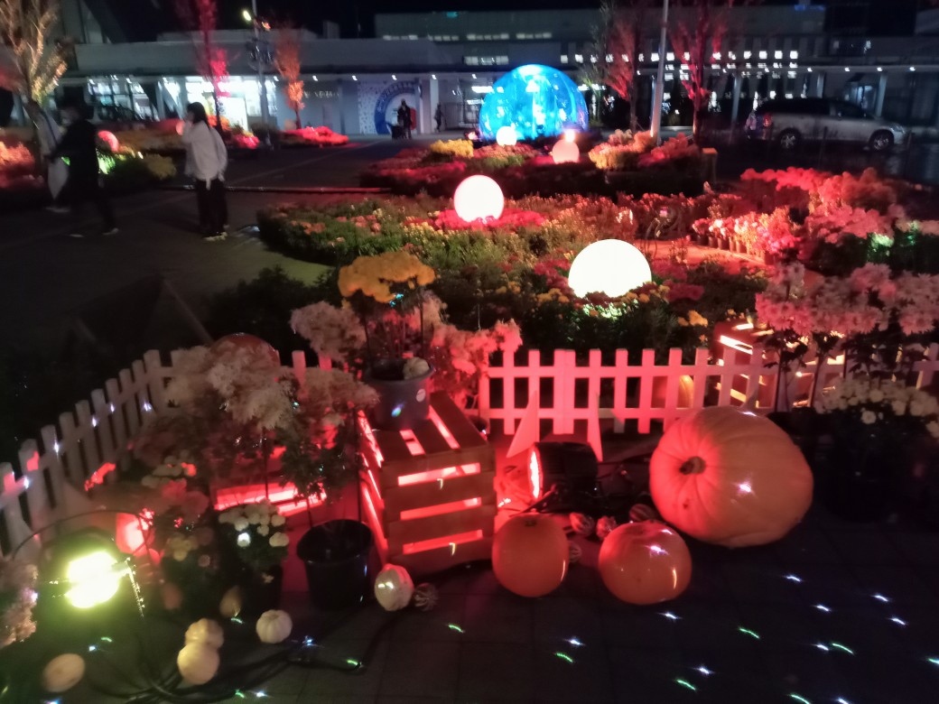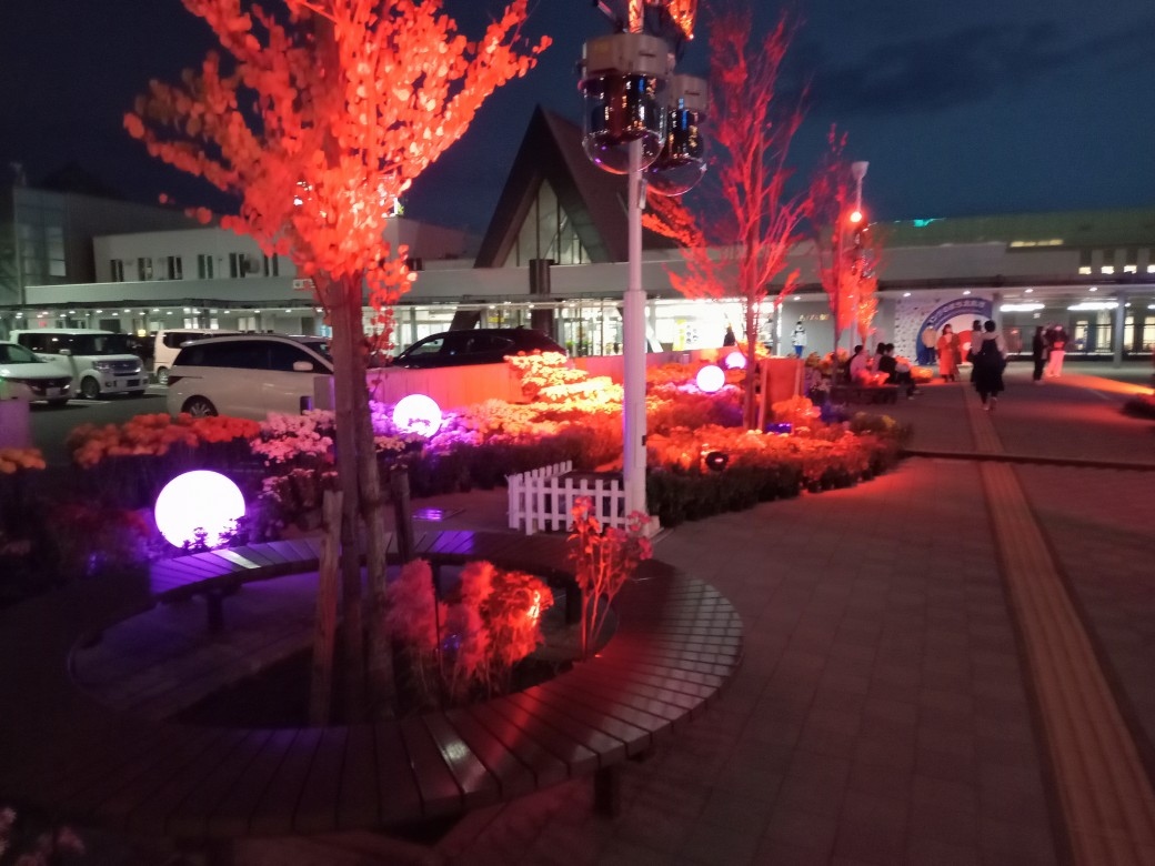 夜にJR北見駅につきました。すると美しいライトアップされたイベントが開かれていました。どうやらハロウィンのイベントのようです。とても美しく、オレンジや青に光が移り変わり、幻想的でした。みんな写真を撮りに集まっています。こんなイベントを駅前で行う北見は素敵ですね。