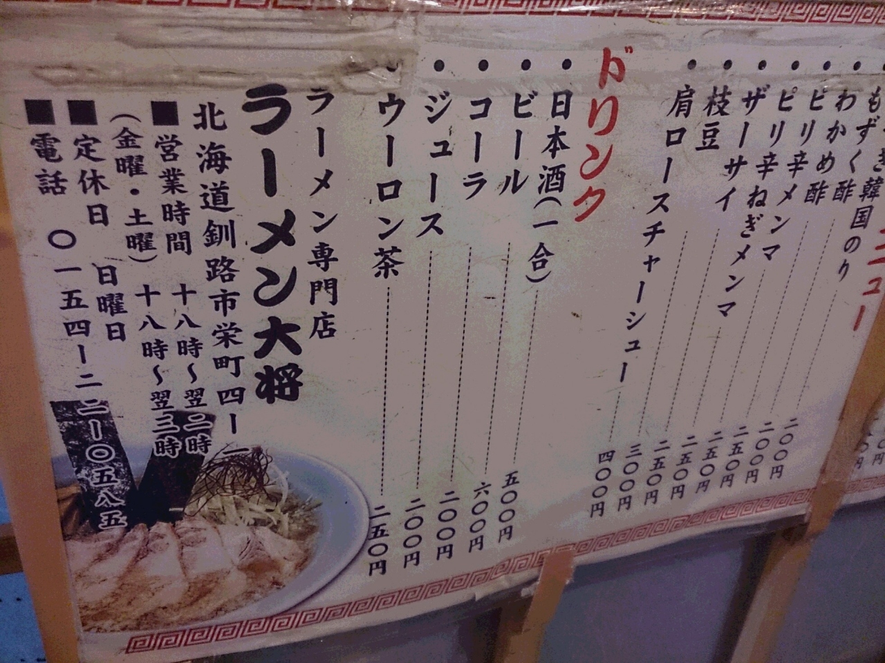 ここのラーメンは、コッテリガツン系。麺も、釧路にしては太く、食べごたえもあります。- 旅行時期