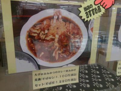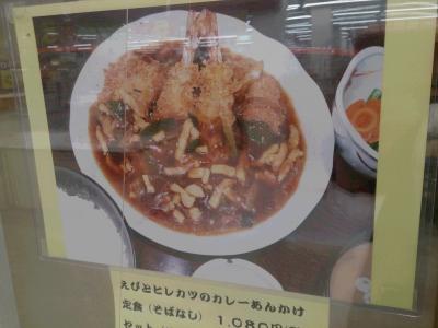 なんともなしに入った日高町富川の農協。何か食べ物をと思い入ると、そこに一軒のそば屋が。普通は、絶対入らないのですが、メニューに気になるものが…。えびととんかつのカレーあんかけ。エビフライととんかつは嫌いな人がいないメニュー。それに万人に愛されるカレー?しかも、あんかけ?カレー自体とろみがあるのであんかけでは?様々な疑問がわいてきて気になってしょうがないので入ることに。出てきました夢の食べ物。メニューでも期待大だったのだが出てきたものは、その期待以上のもの。これには恐れ入った。そびえたつエビフライを支えるようにカレーにつかるとんかつ。ここはそば屋なので